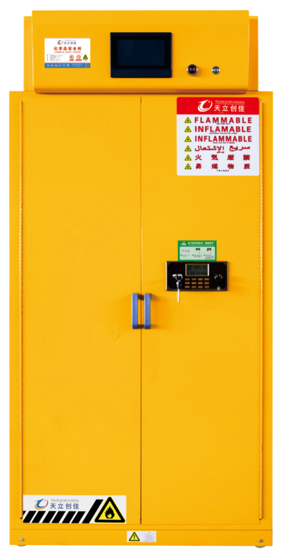 *柜体内胆(上、下、左、右内衬板)全部采用瓷白 pp(聚丙烯树脂)板;柜底右侧设304可调进风口,有不锈钢可调风阀;柜体内部最下层留有可以存放不少于 120mm 厚黄沙的填埋腔(漏液漕),用于埋放金属钠、黄磷(白磷)等的易燃物品,挡板应与柜体连为一体;柜底装有四个Φ50mm 的移动钢轮,便于易燃品毒害品储存柜移动;前轮有 2 个手动调节罗杆,方便易燃品毒害品储存柜定位。