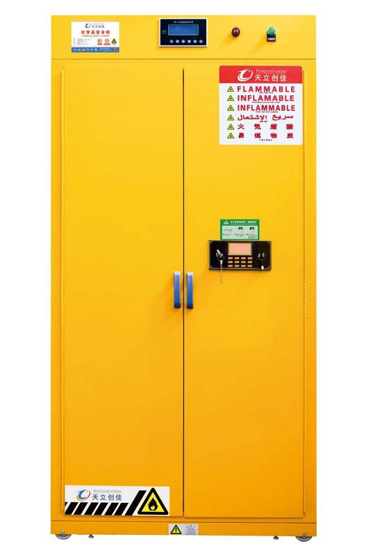 2、柜体内胆(上、下、左、右内衬板)全部采用瓷白聚丙烯树脂板;柜底右侧设可调进风口,有PP可调风阀;柜体内部最下层留有可以存放不少于120mm厚黄沙填埋腔(漏液漕),用于埋放金属钠、黄磷(白磷)等的易燃物品,挡板应与柜体连为一体;柜底装有四个φ50mm的移动尼龙脚轮,便于易燃品毒害品储存柜移动。